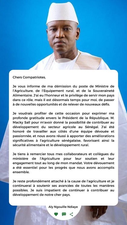 Je vous informe de ma démission du poste de Ministre de l’Agriculture, de l’Equipement rural, et de la Souveraineté Alimentaire. J’ai eu l’honneur et le privilège de servir mon pays dans ce rôle, mais il est désormais temps pour moi, de passer à de nouvelles opportunités et de relever de nouveaux défis.